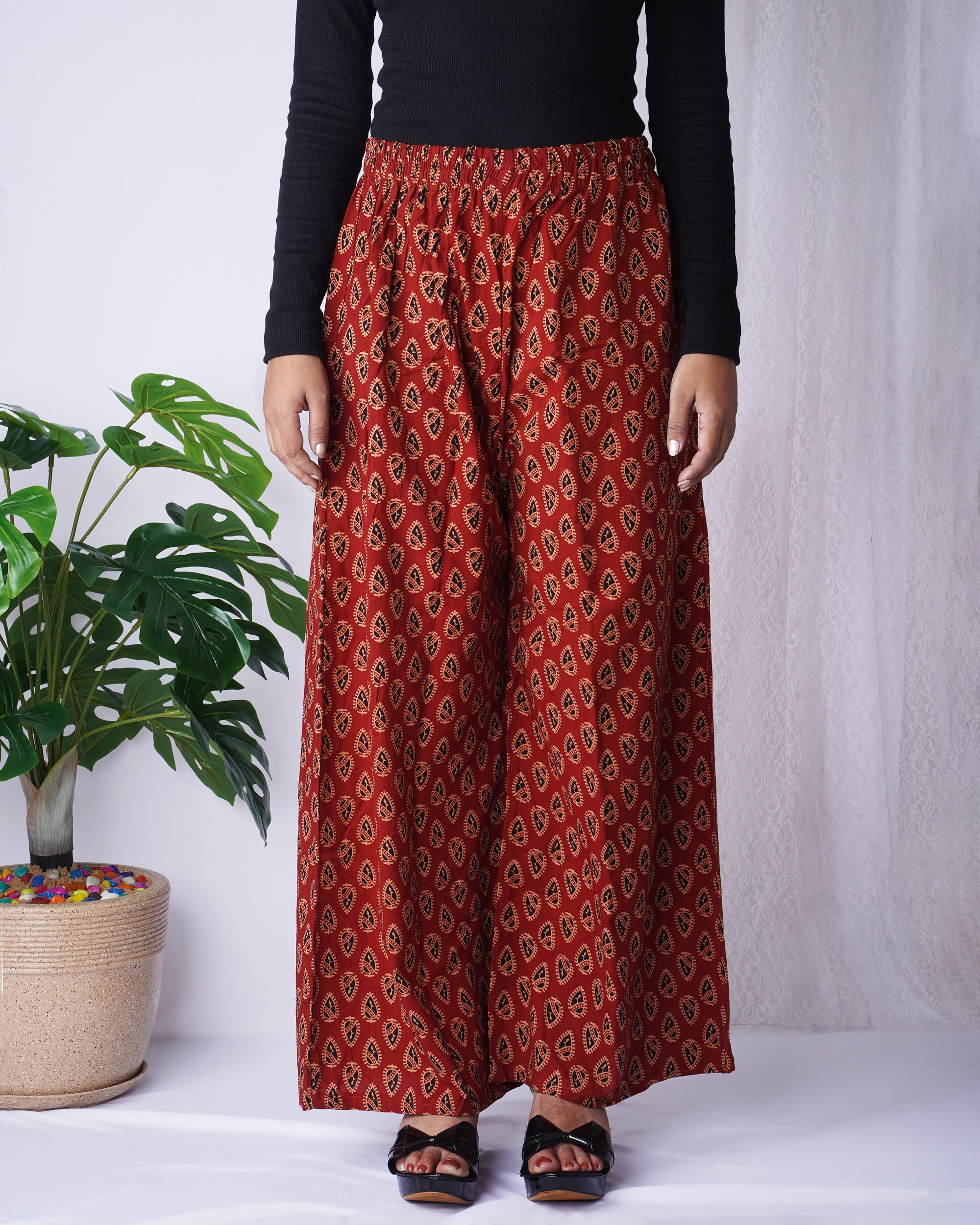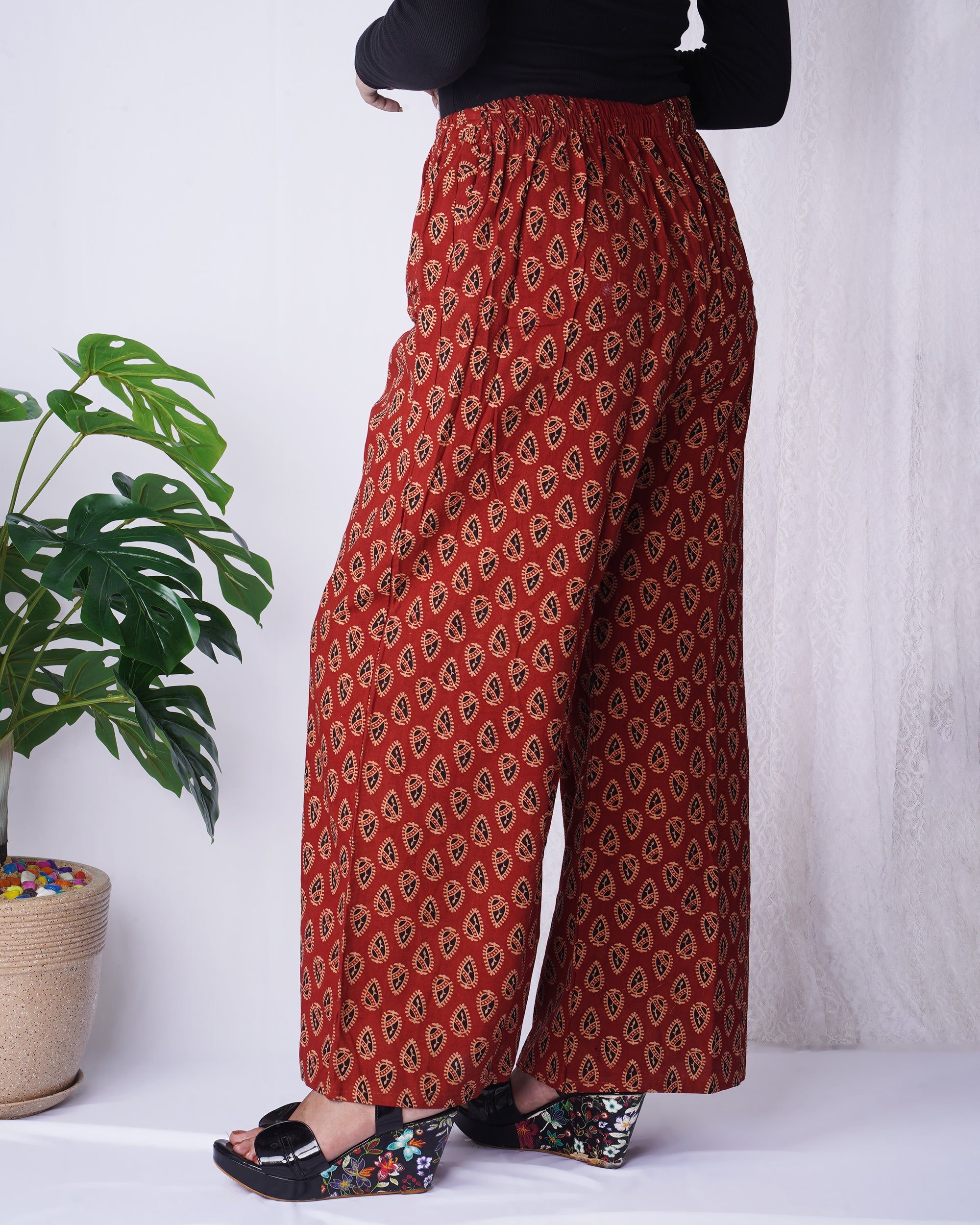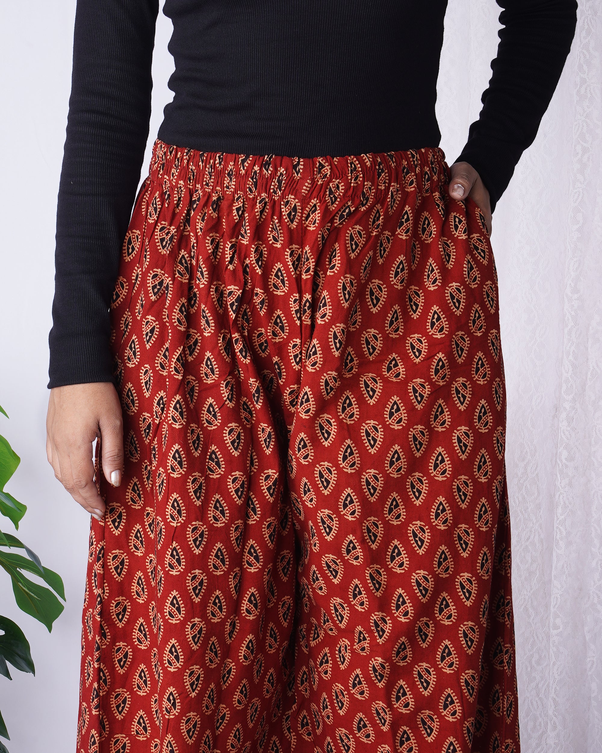 Add a touch of tradition with modern ease in these rust red block print palazzo pants. Crafted from soft, breathable...