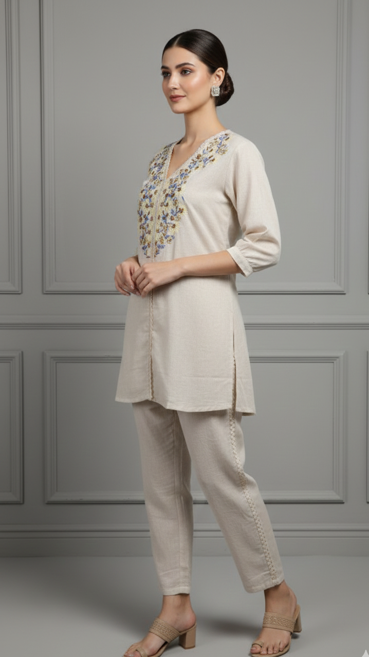 Step into timeless elegance with this Cream Embroidery Work Co-Ord Set, designed for women who love subtle sophistication. Crafted in...