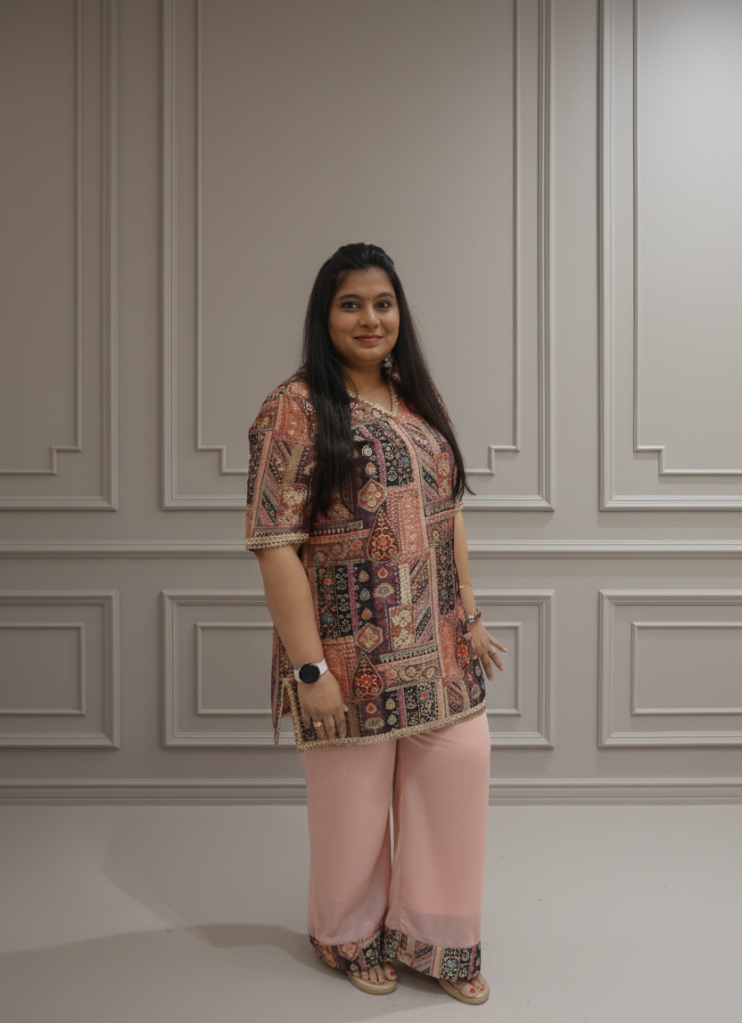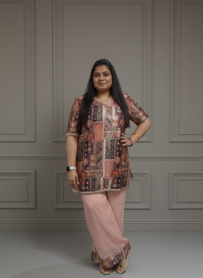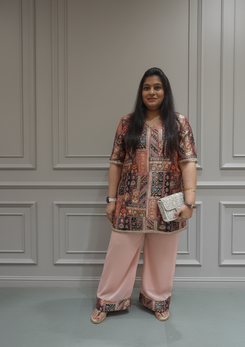 Boho Chic Printed Cord Set in Peach & Multi-Color