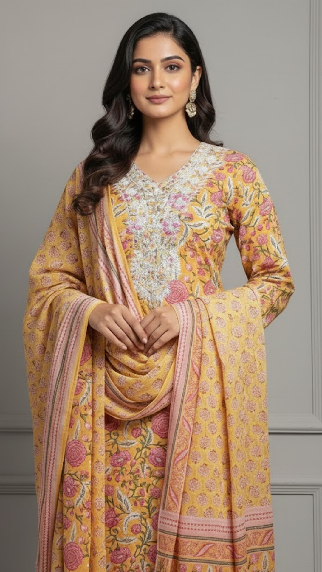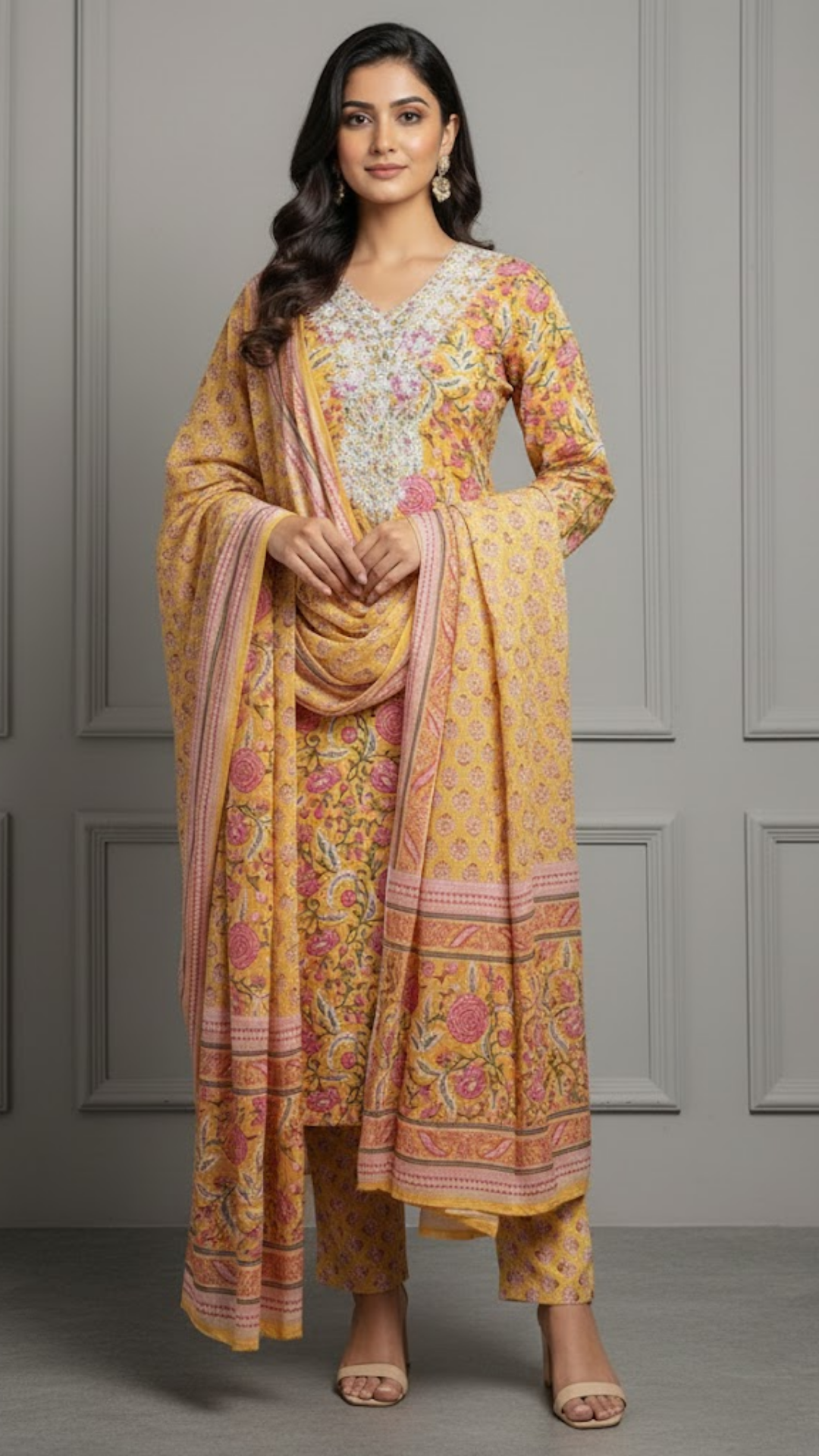 Bright, breezy, and full of charm — this mustard Punjabi suit set brings everyday elegance to life. Adorned with a...