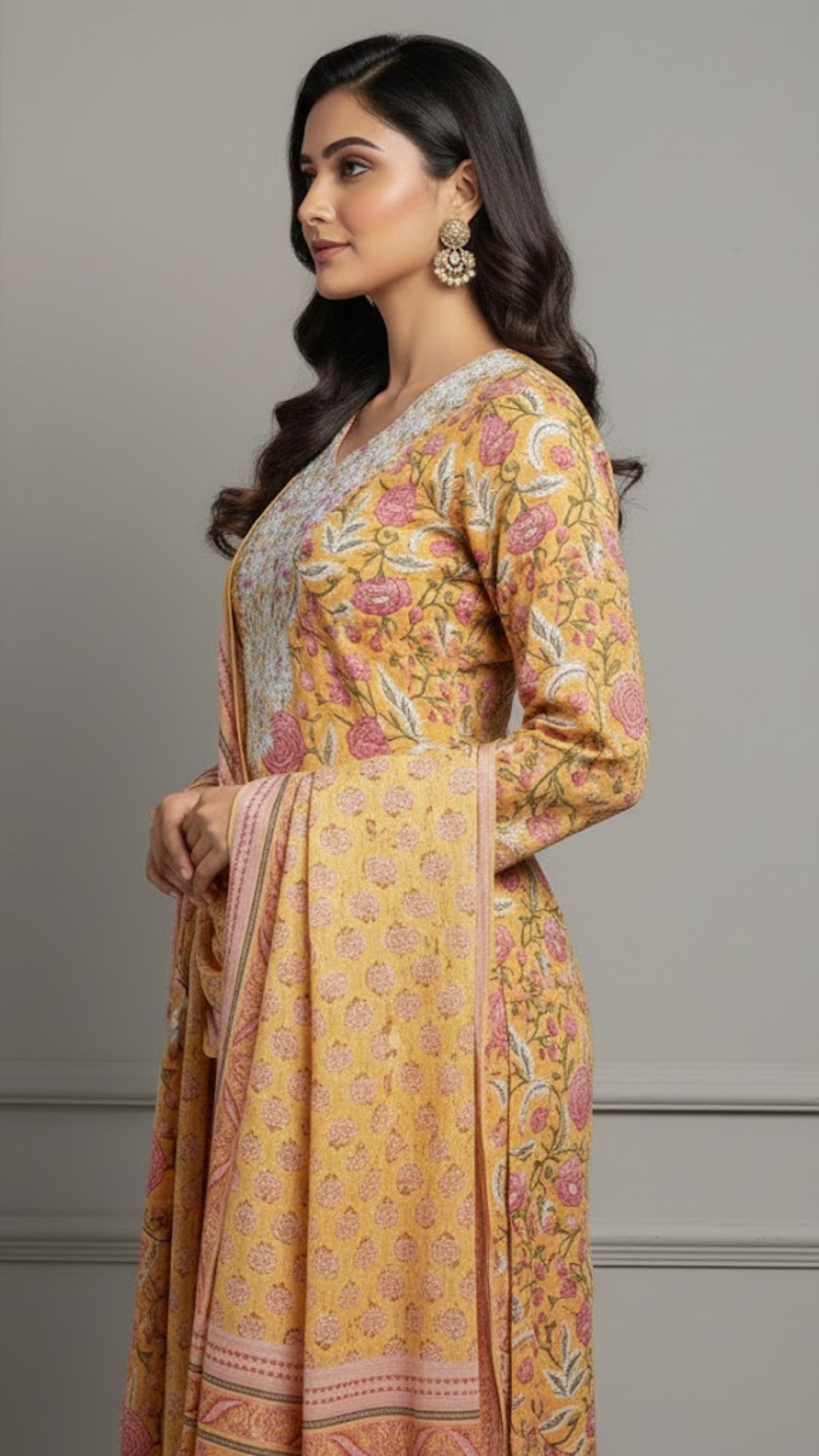 Floral Printed Mustard Punjabi Suit Set with White Thread Embroidery