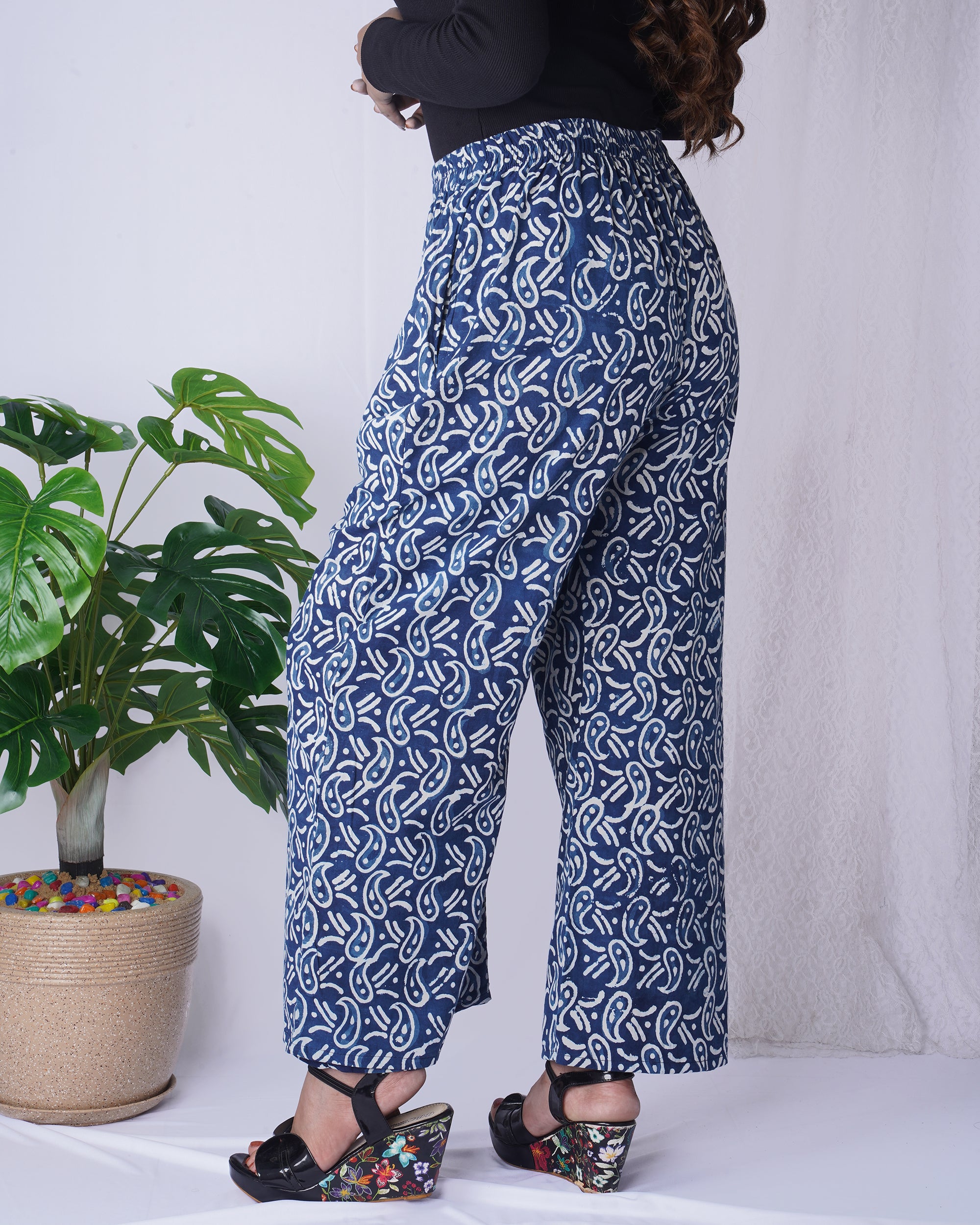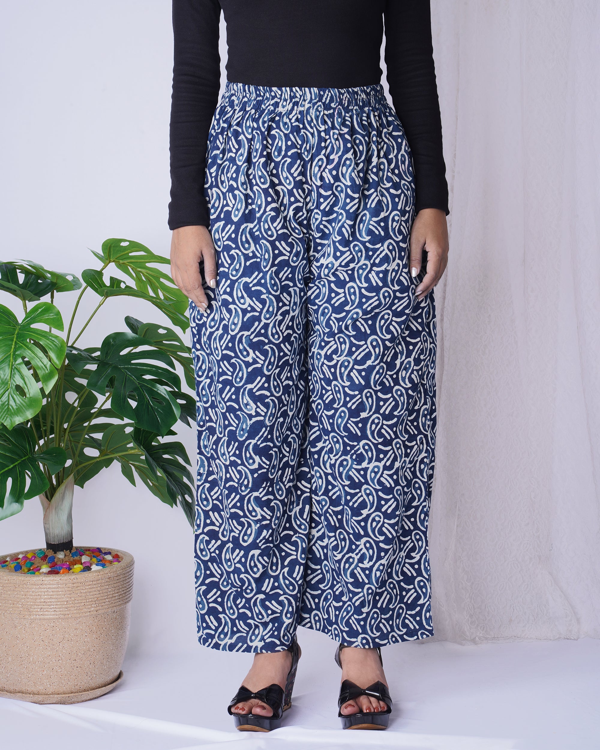 Navy Blue Handblock Printed Cotton Palazzo Pants