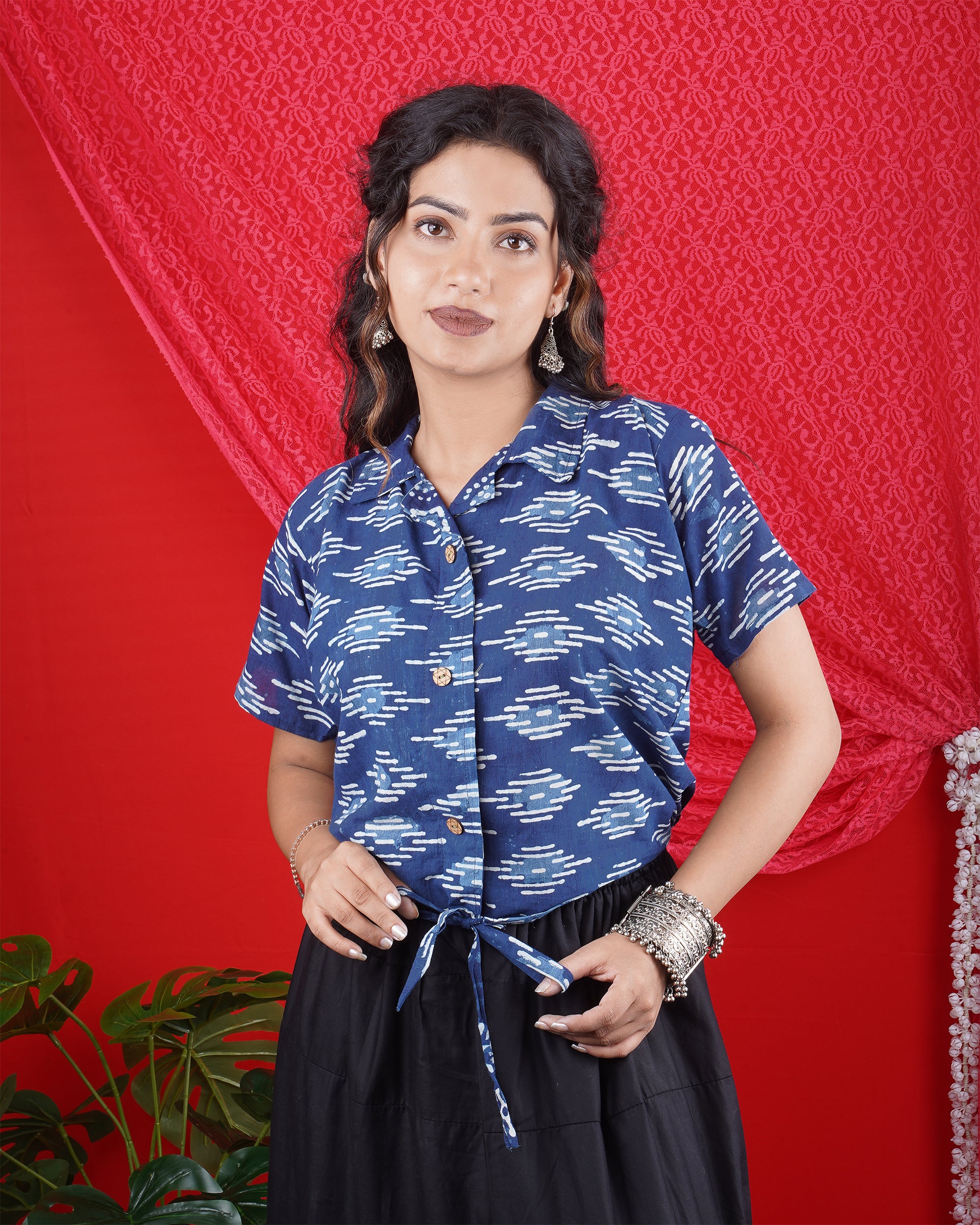Handcrafted Indigo Ikat Cotton Shirt with Tie-Up Front