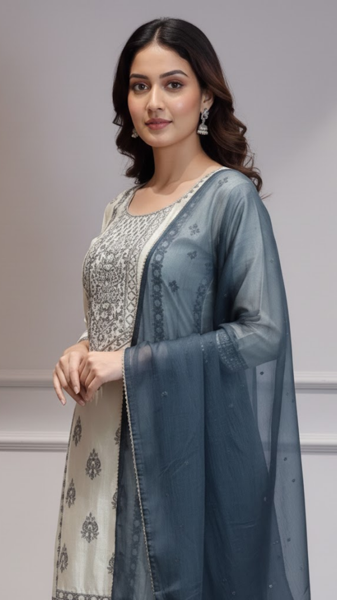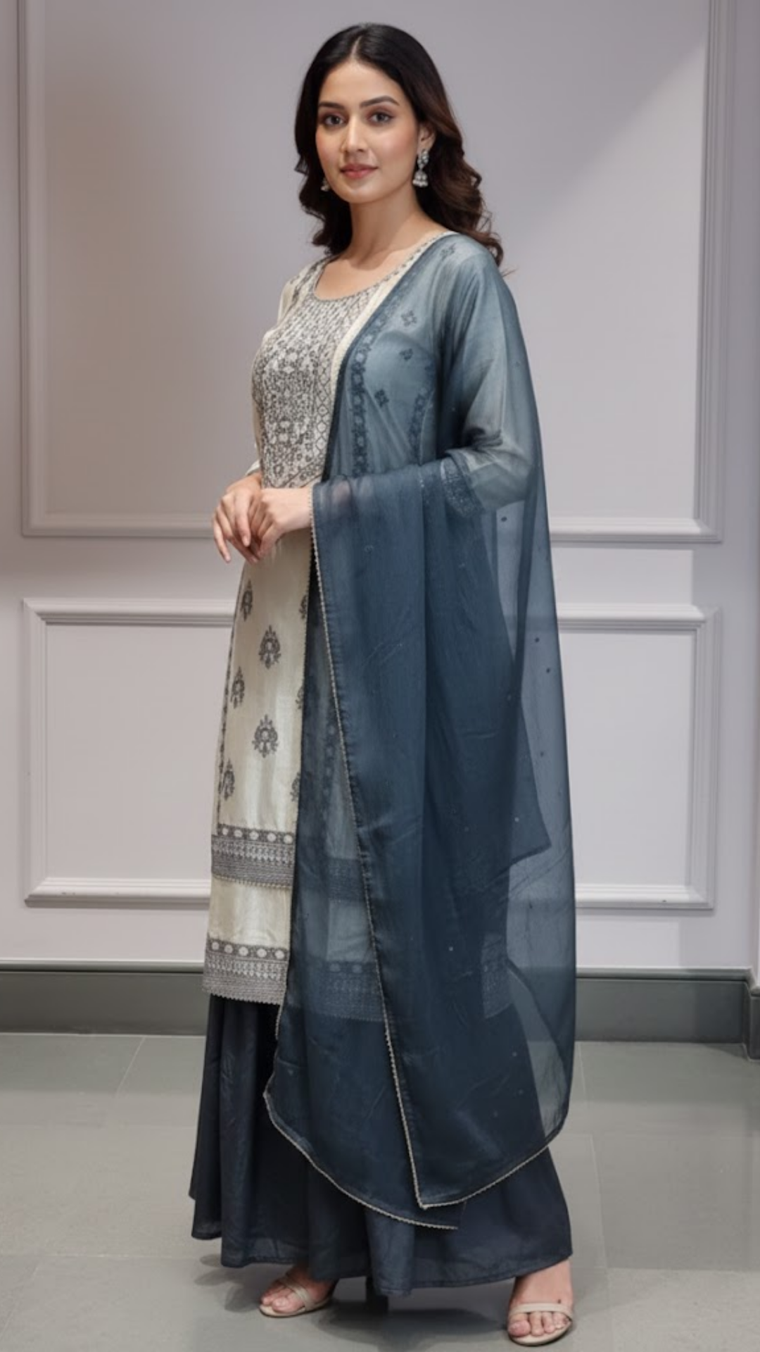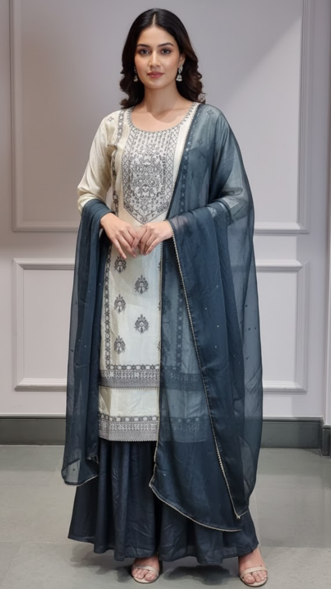 Make a statement in this stunning ivory and navy blue Punjabi sharara suit, featuring rich embroidery and a graceful silhouette....