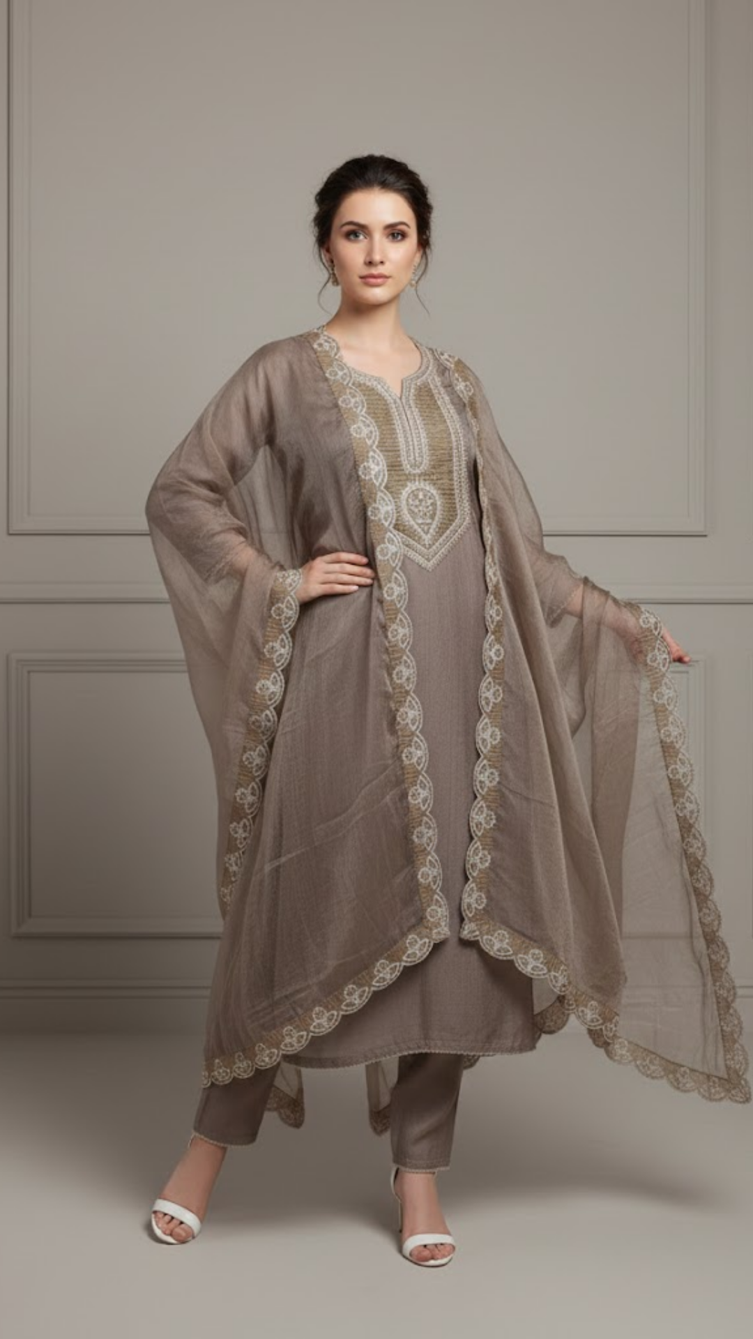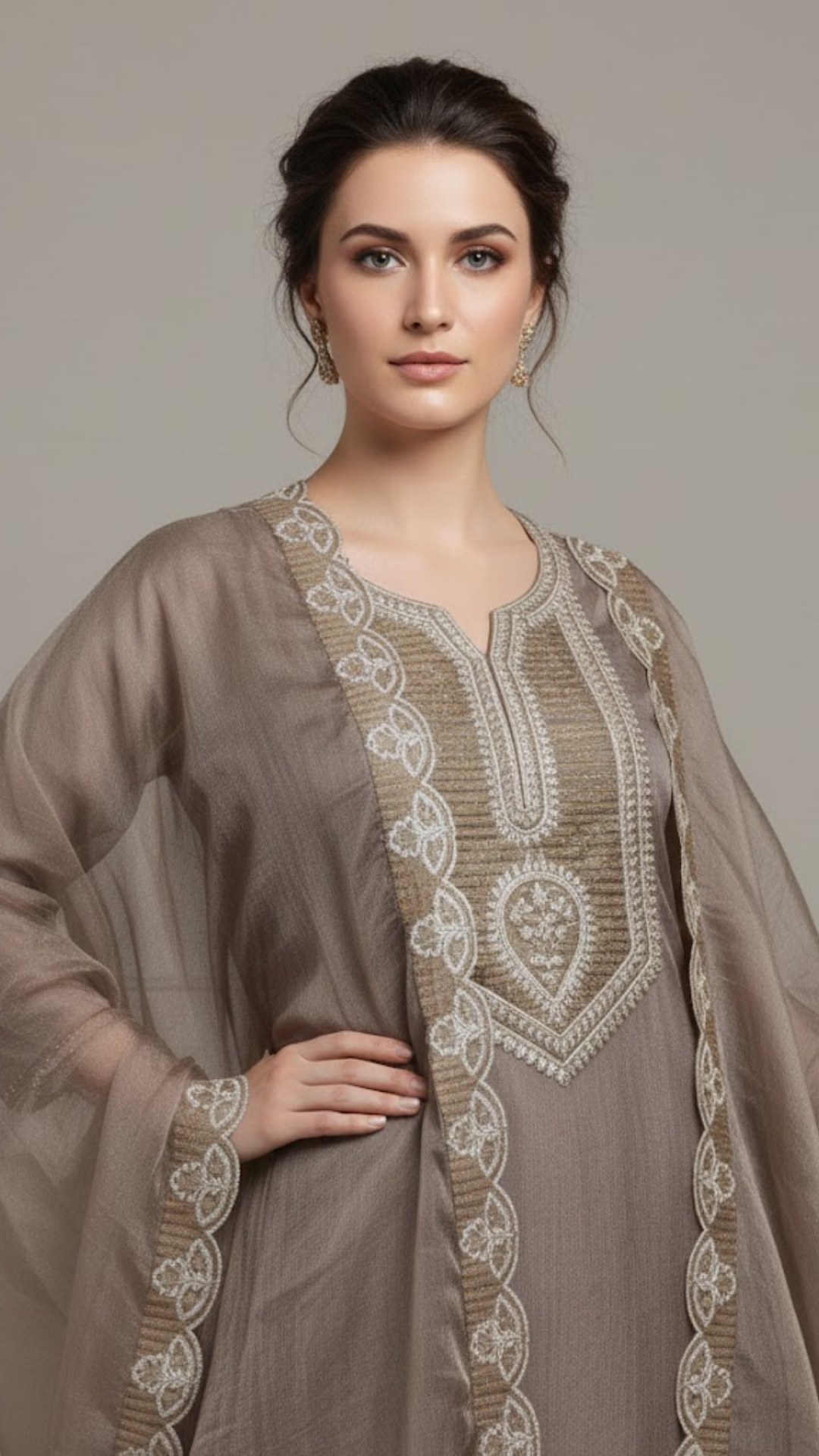 Mocha Brown Hand-Embroidered Punjabi Suit Set with Dupatta