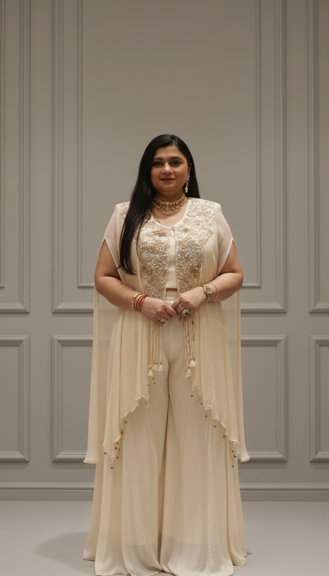 Sophisticated off-white Indo-Western co-ord set crafted in premium tissue fabric with soft twill net detailing. Designed with a graceful, flowy...