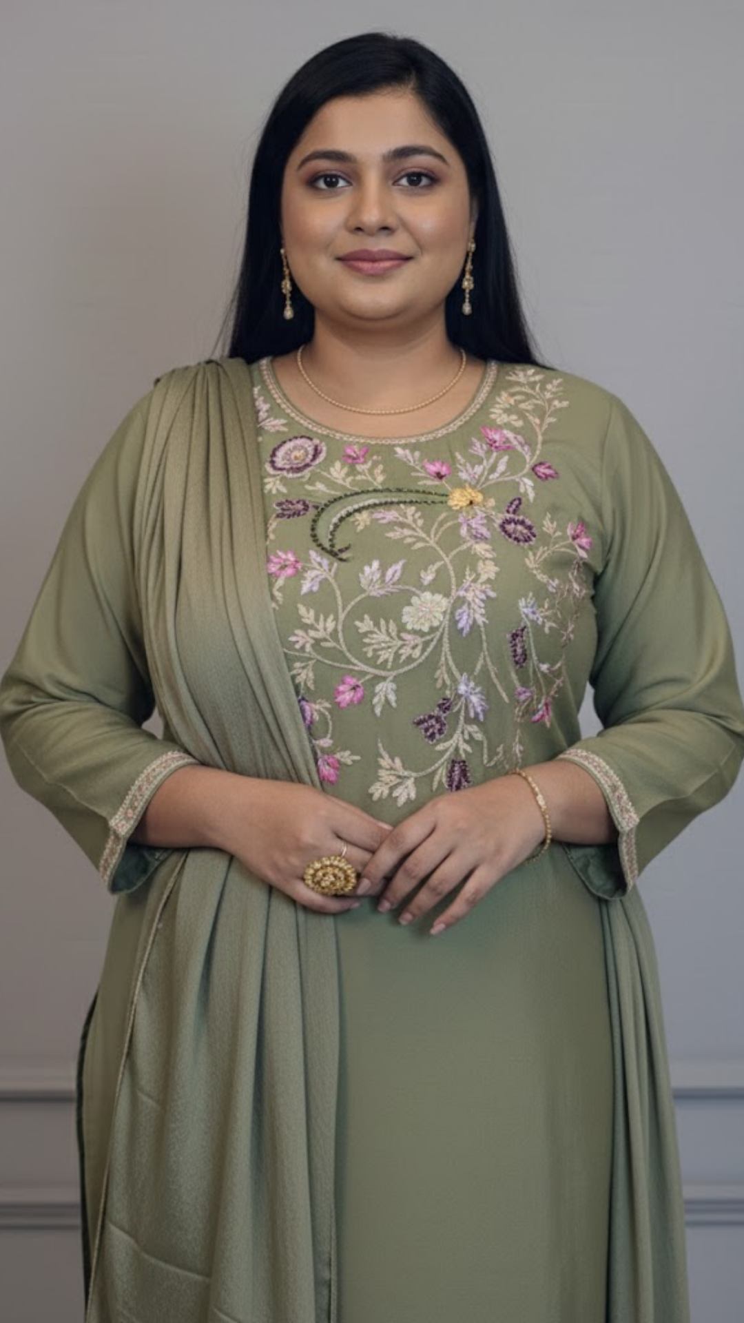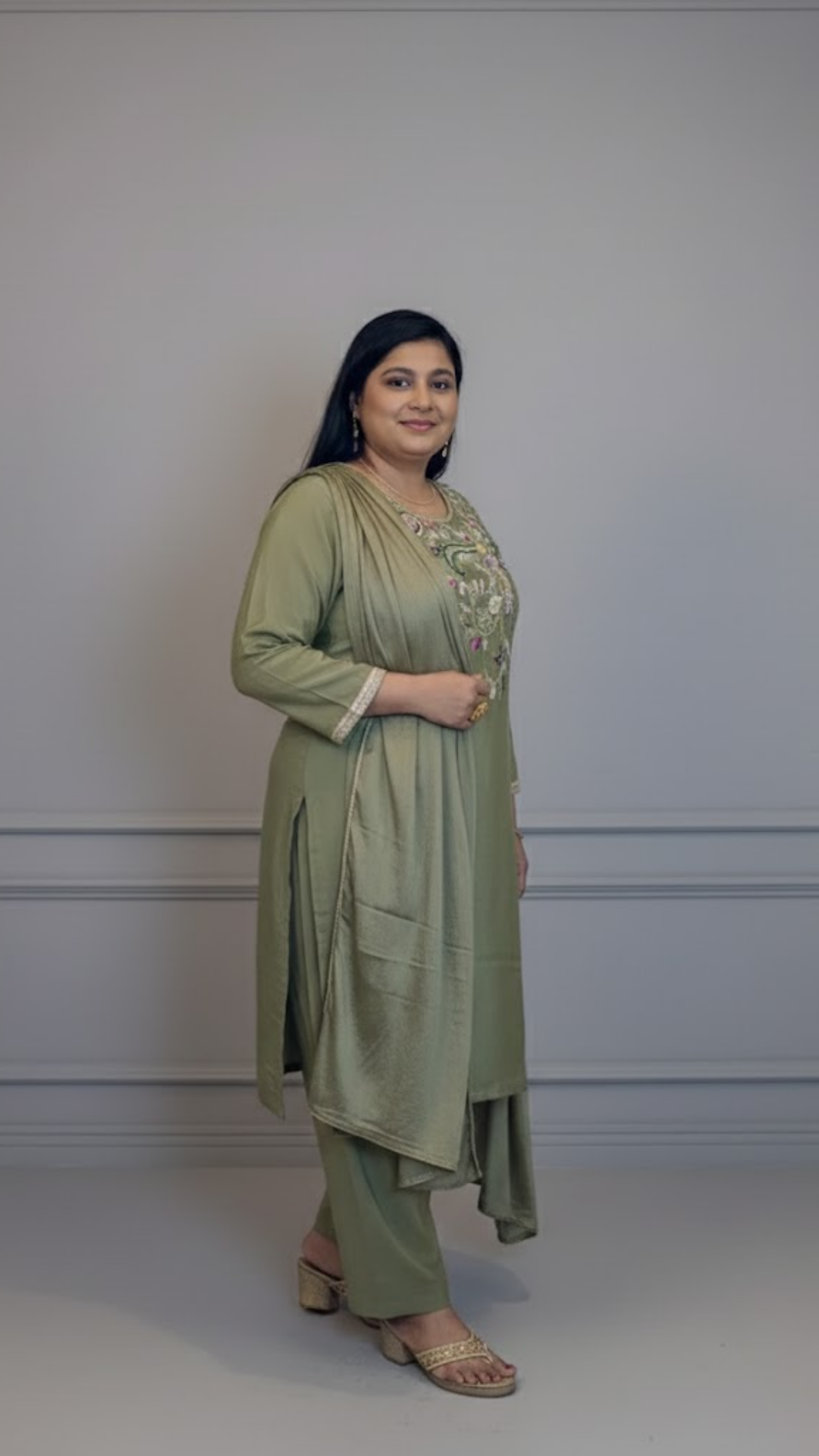 Turn heads this festive season with our Olive Green Hand-Embroidered Kurta Set. Adorned with intricate beadwork, sequins, and colorful thread...