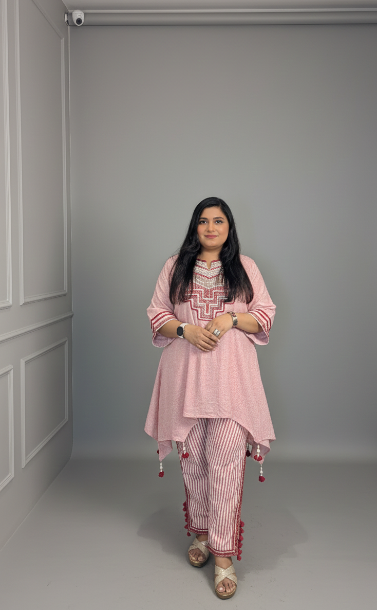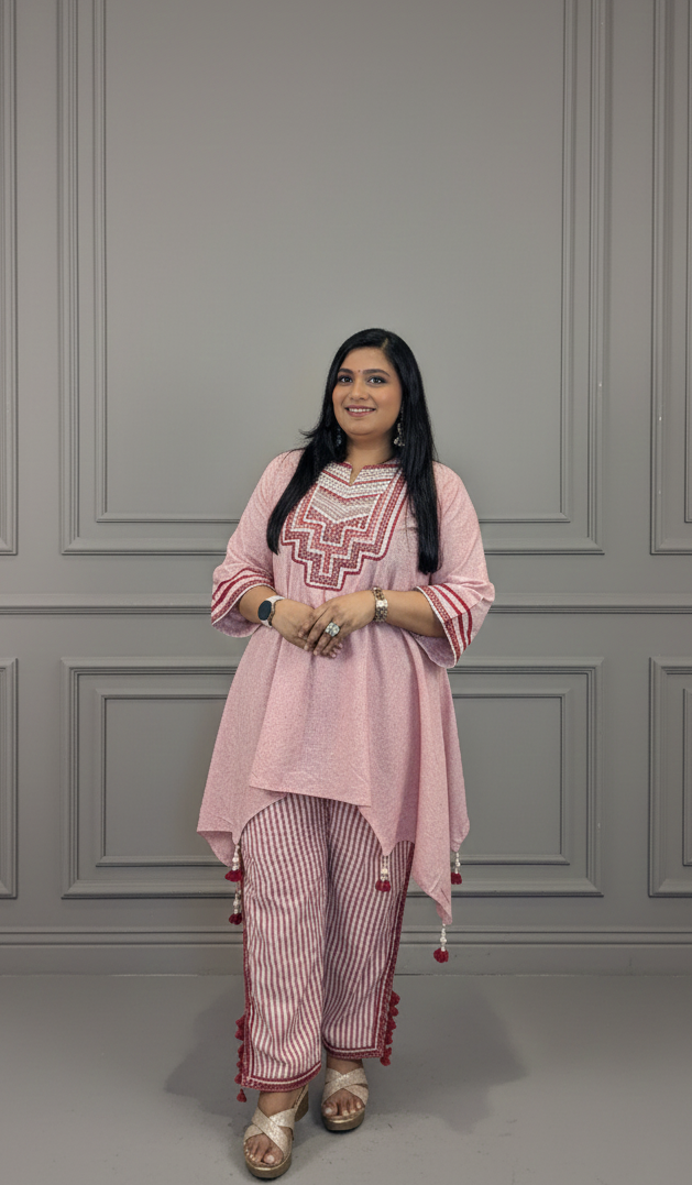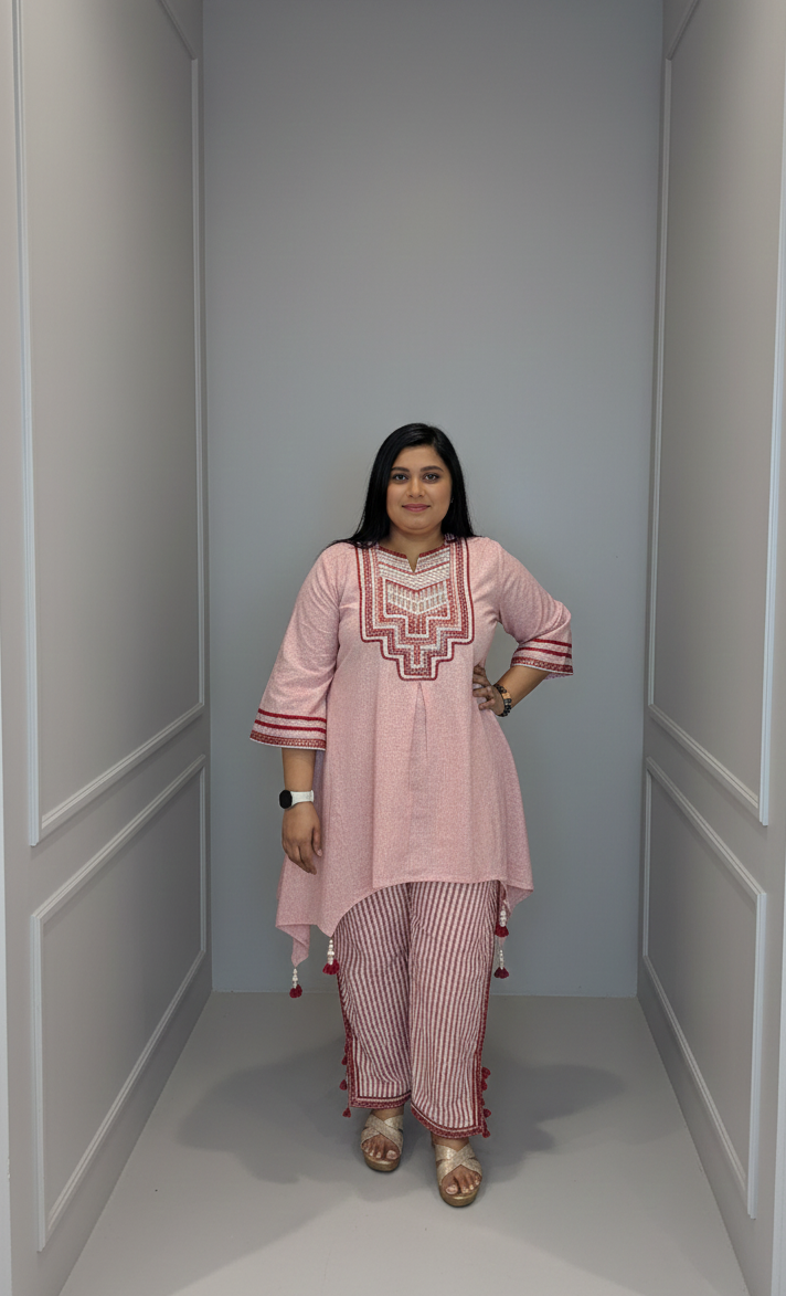 Channel soft elegance and effortless charm with this Peach & Maroon Co-ord Set designed for modern comfort with a traditional...