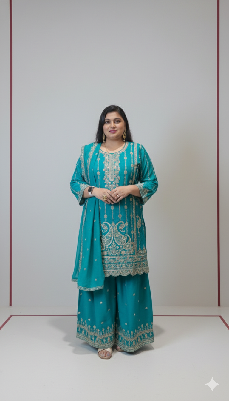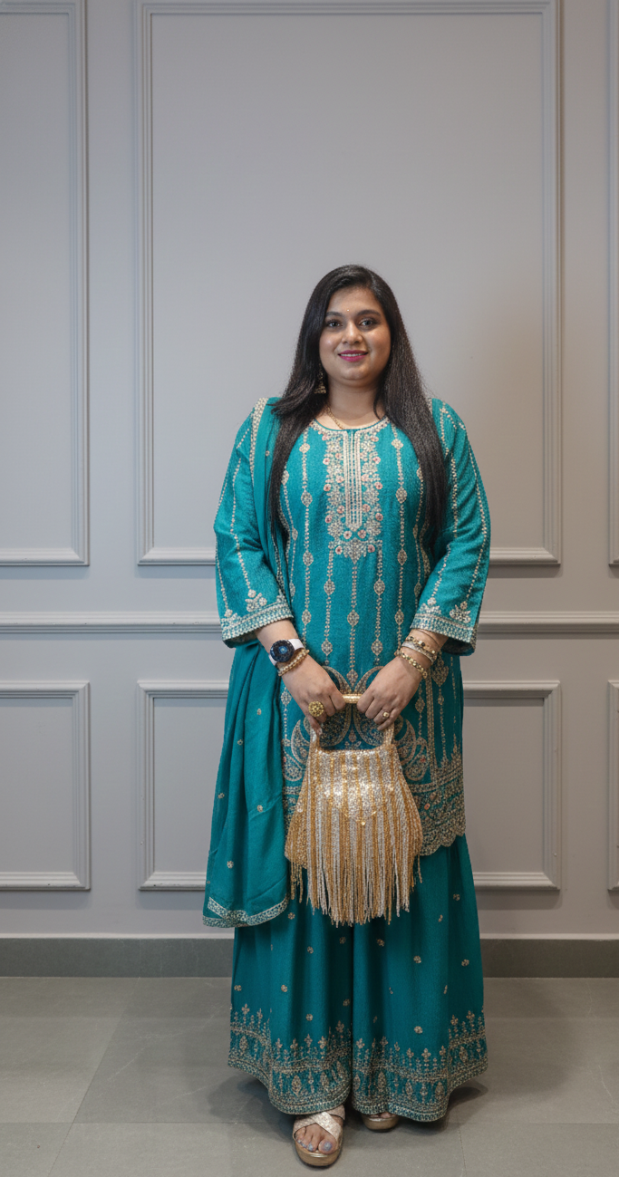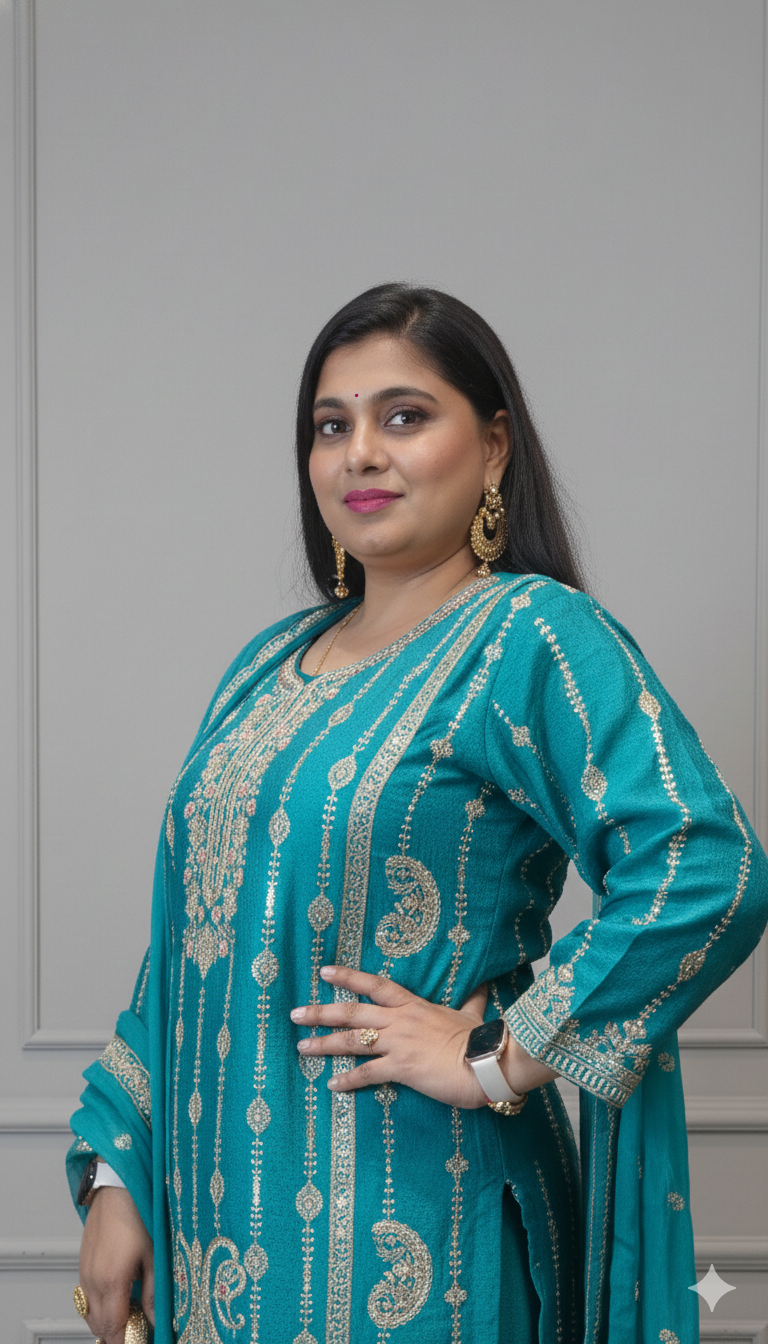 Embrace the rich, majestic tones of this Peacock Green Punjabi Suit, designed to make you the center of attention at...