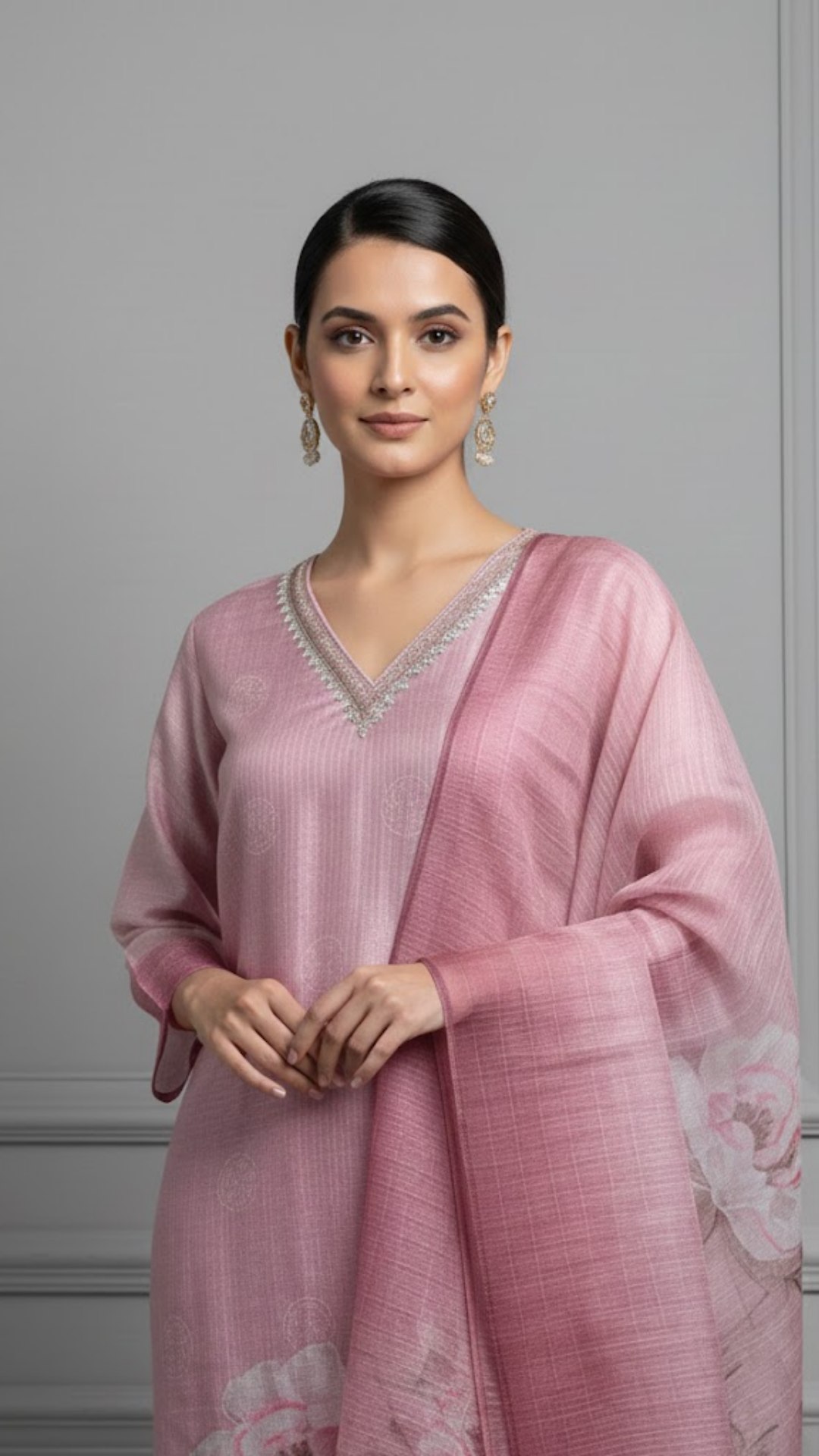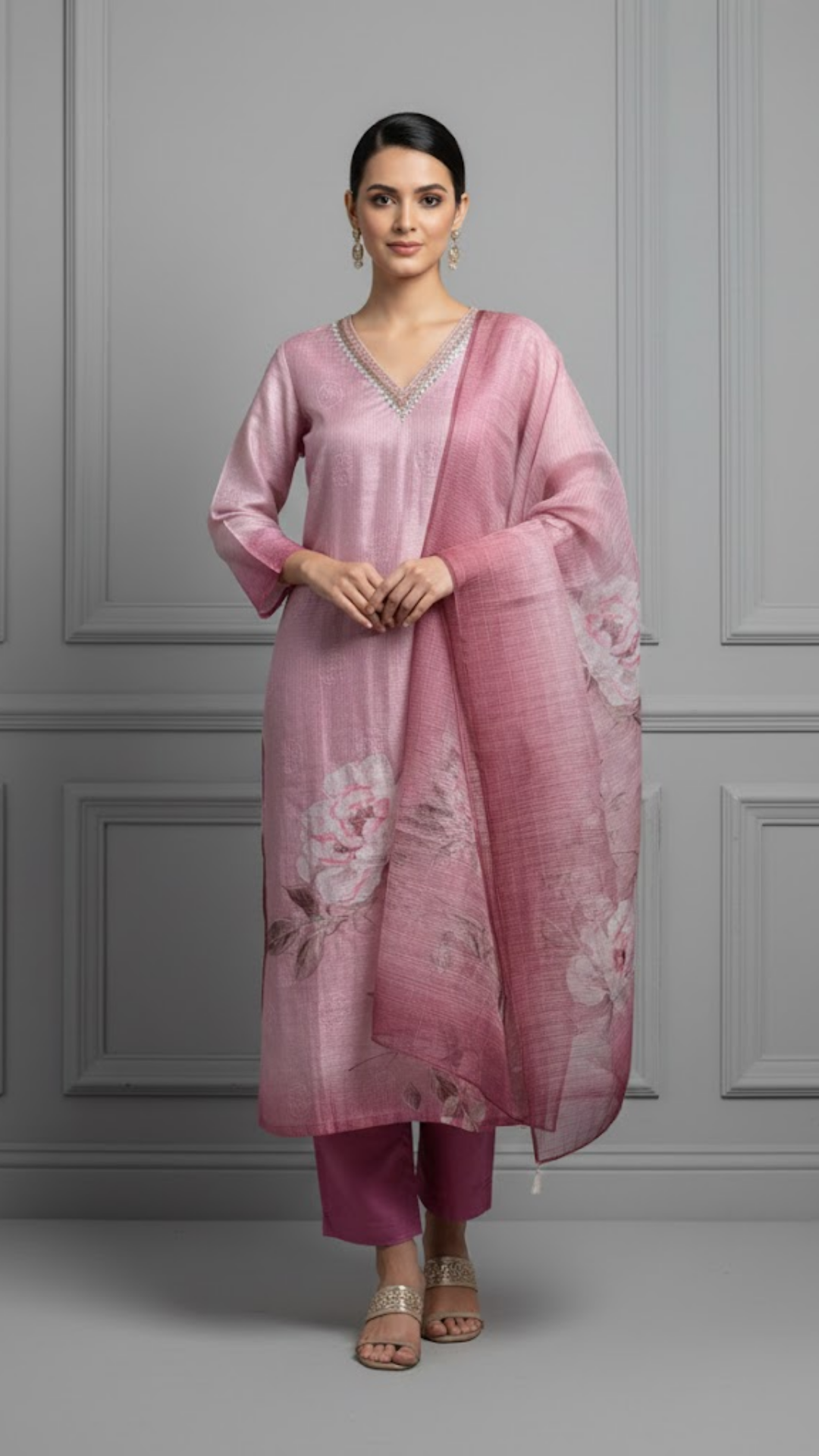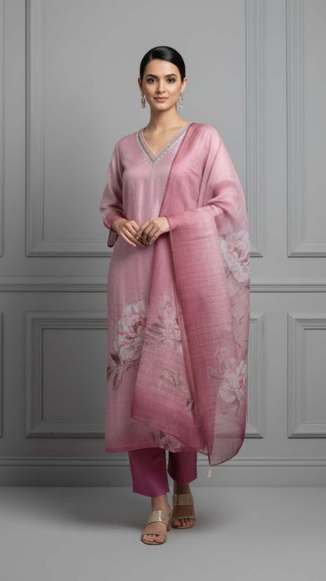 Rosette Glow Handcrafted Kota Ensemble – Where Grace Blooms Softly Embrace elegance in its most delicate form with our Rosette...