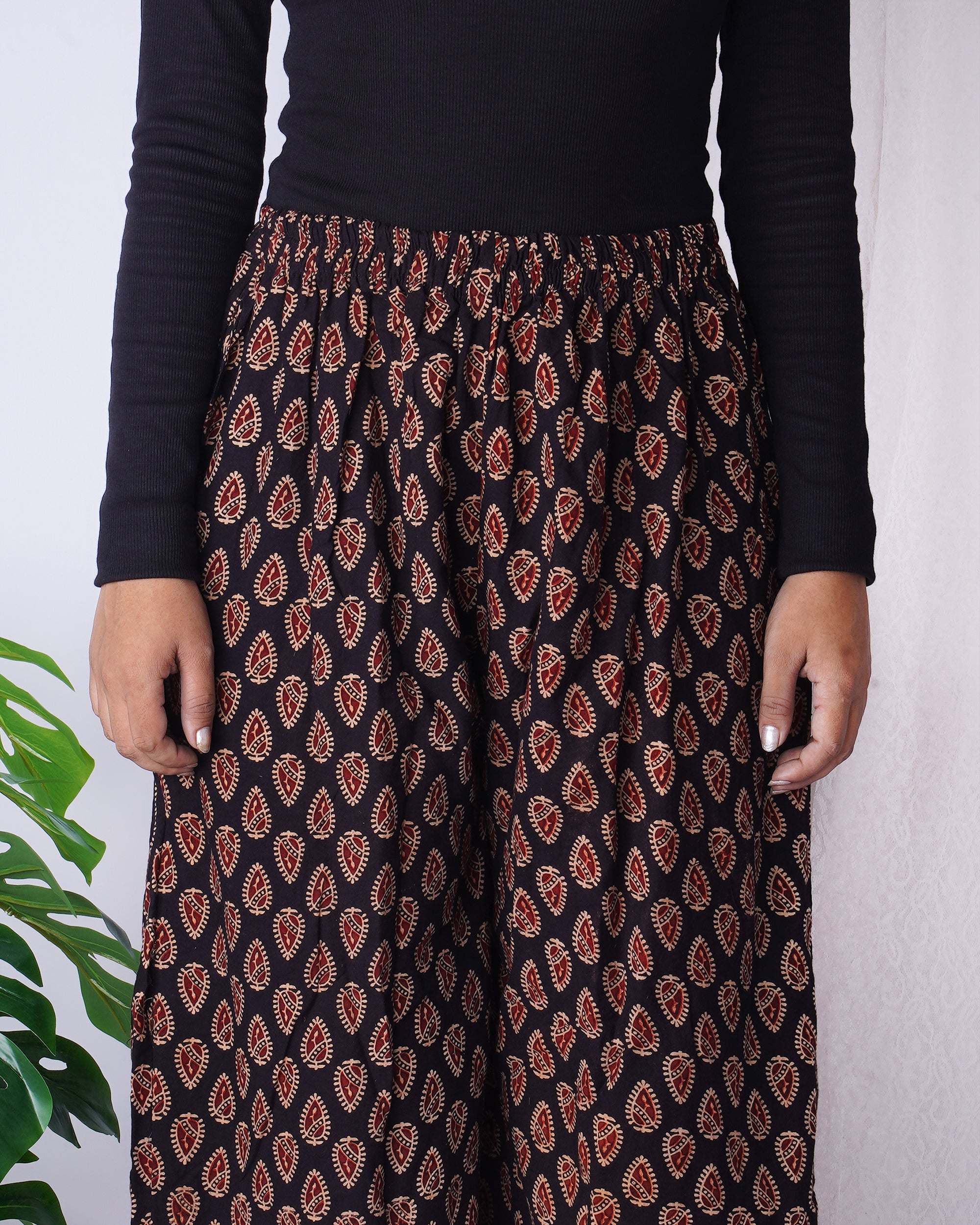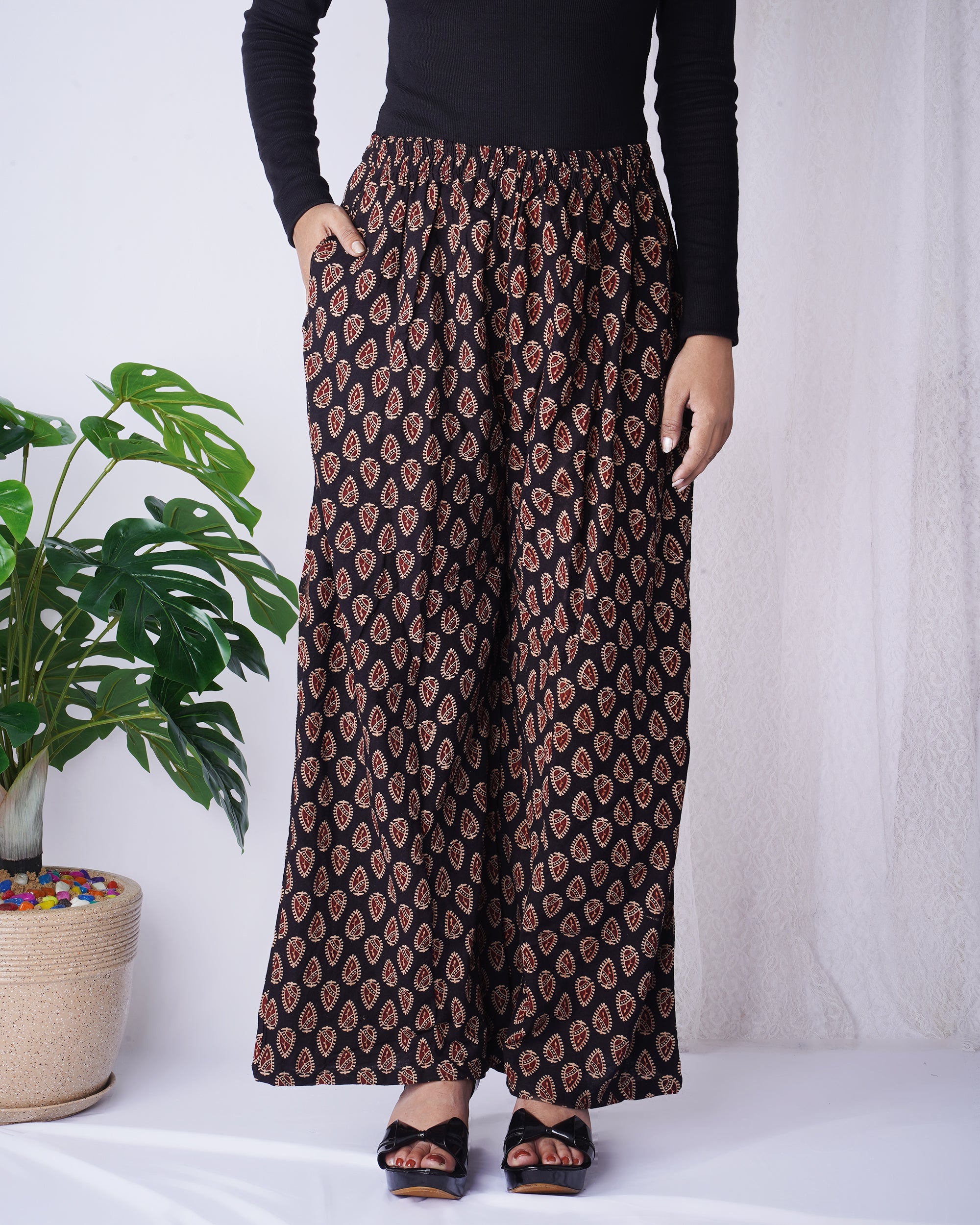Step into effortless elegance with these black leaf print palazzo pants. Designed with a wide-leg silhouette and a soft, breathable...