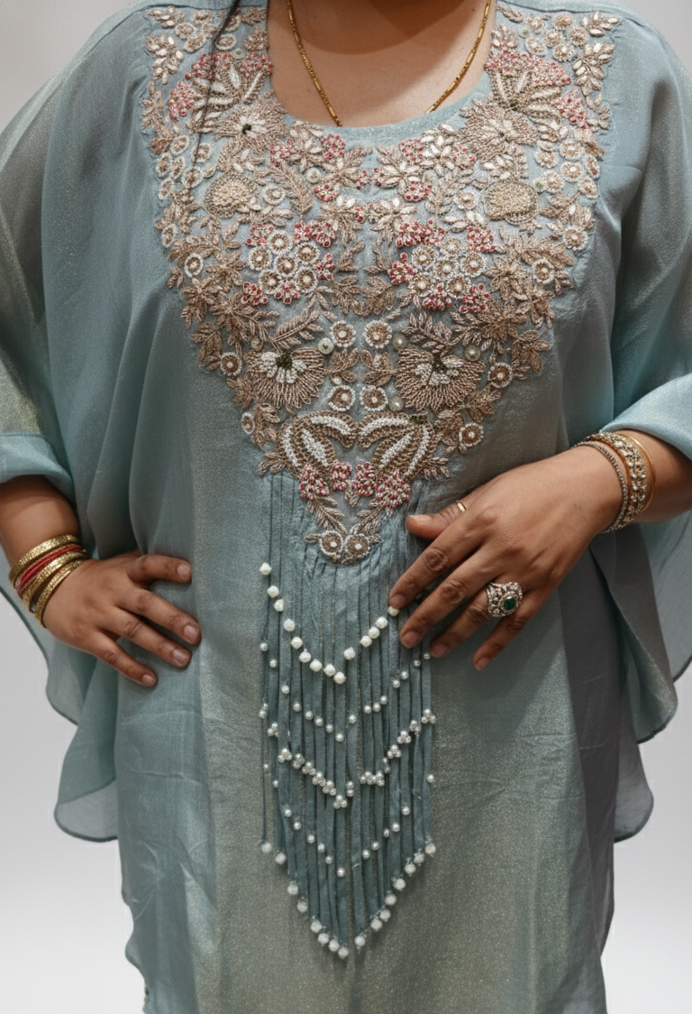 Refreshing sea blue Indo-Western co-ord set crafted in elegant tissue fabric with delicate twill net detailing. Featuring a flowy silhouette...