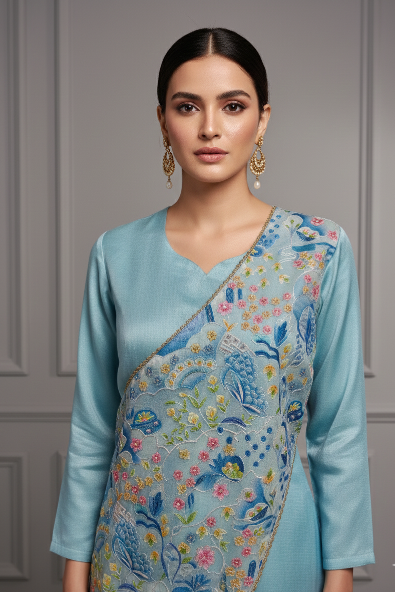 Elevate your ethnic wardrobe with this ethereal Sky Blue Draped Floral Co-ord Set. Featuring an elegant floral drape layered across...