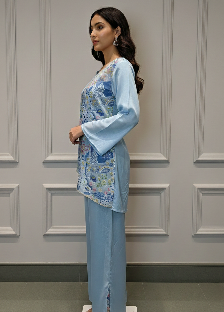 Sky Blue Draped Floral Fusion Co-ord Set