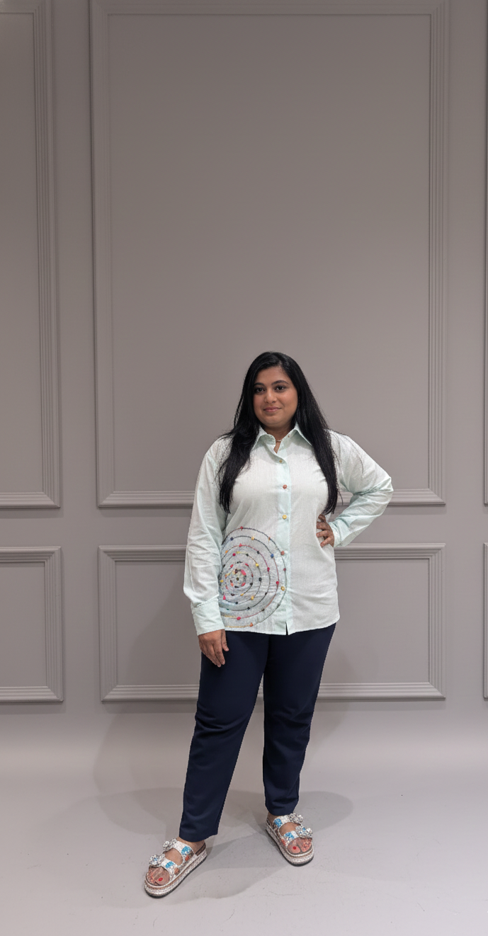White Collared Spiral Embroidered Shirt – Vibrant Detail with a Smart Twist