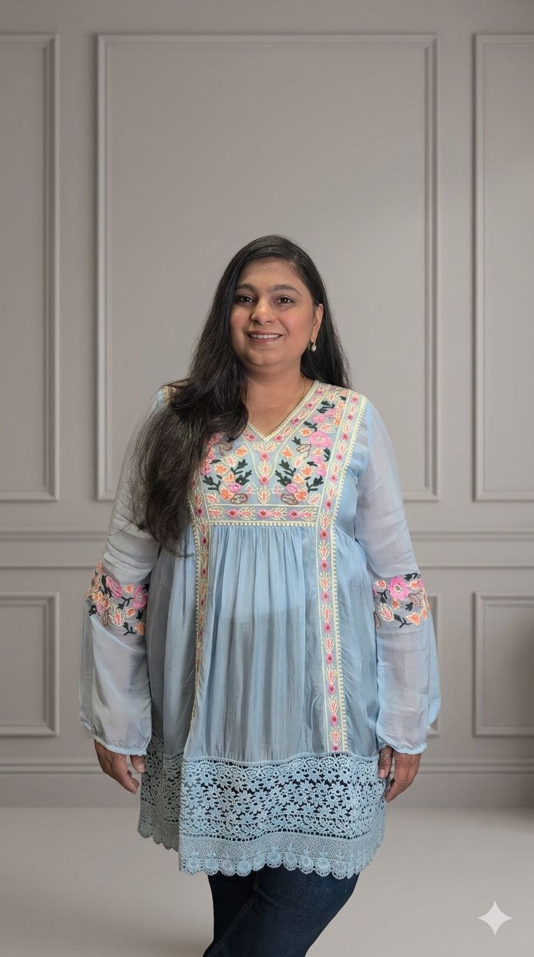 Elevate your fusion wear collection with this exquisitely crafted short top. Designed with a modern peplum silhouette and delicate artisanal...